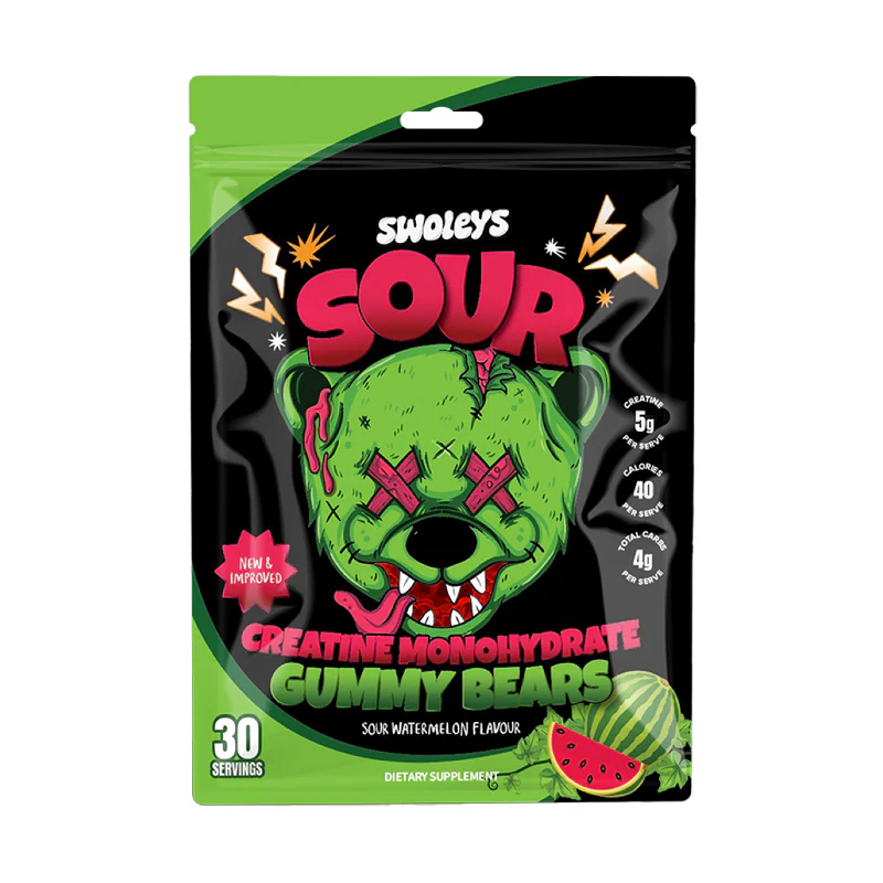 Swoleys Sour Creatine Gummy Bears offer a fun, tasty, and convenient way to support your creatine intake. Each serving of three gummies delivers 5g of creatine monohydrate, with just 40 calories and 4g of carbohydrates. Available in mouth-watering sour flavours like peach and watermelon, these gummies are designed for those who prefer a sweet and sour twist to their supplement routine, making them an easy post-training treat without the need for mixing powders or drinks.